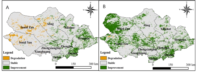 渾善達(dá)克沙地植被質(zhì)量變化空間分異參考基線(A)與現(xiàn)狀(B) 。圖源:中國(guó)林科院荒漠化研究所