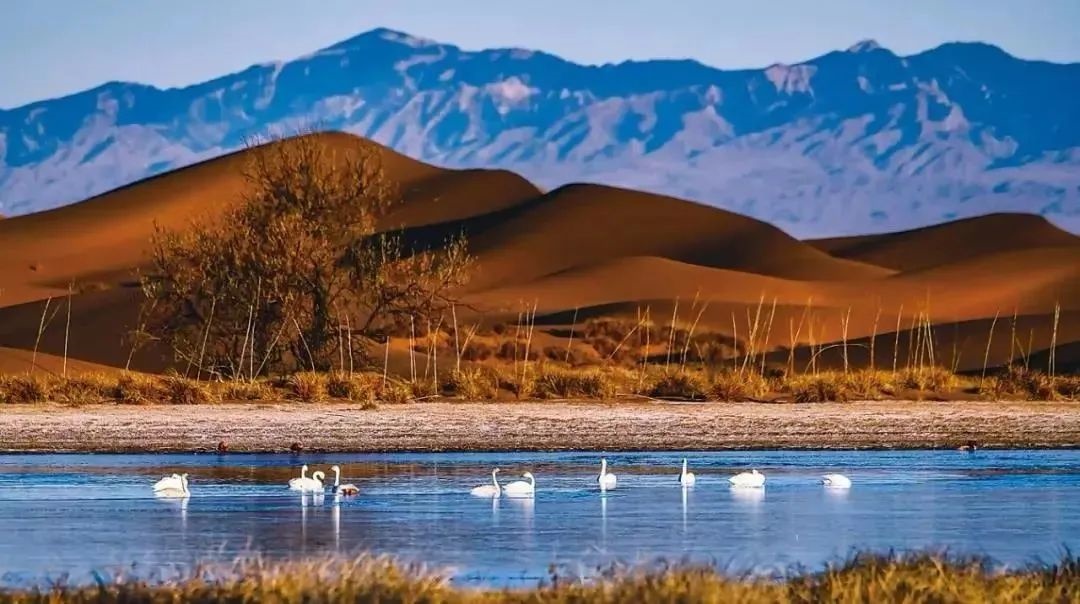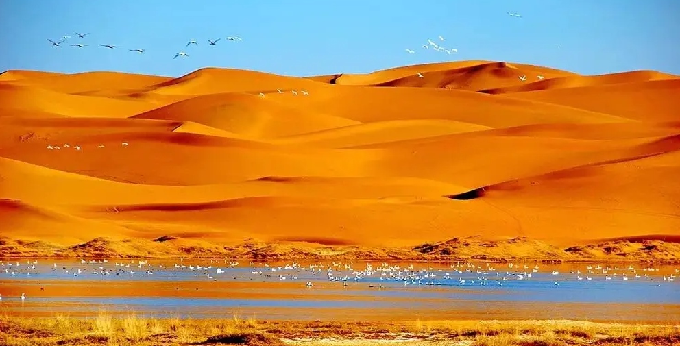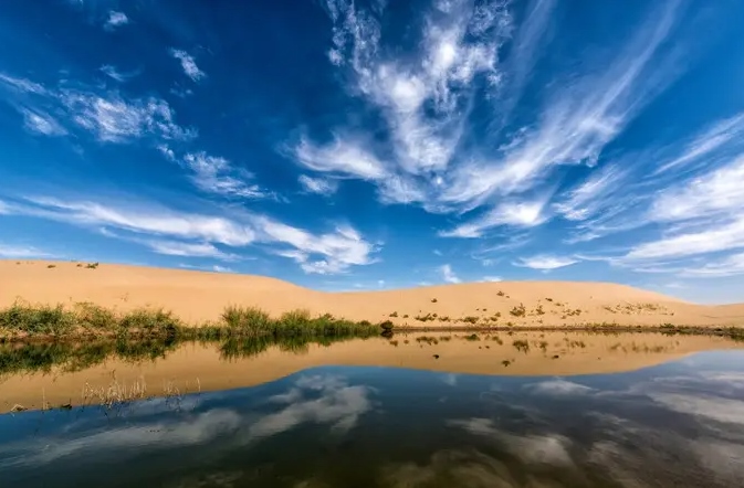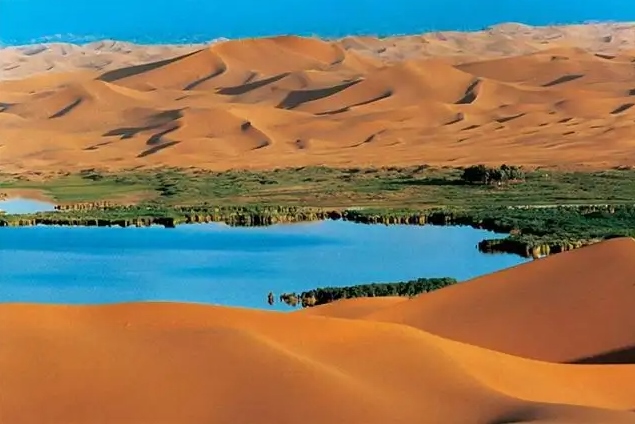 巴丹吉林沙漠年降水量不足40毫米,但是沙漠中的湖泊竟然多達(dá)100多個。高聳入云的沙山,神秘莫測的鳴沙,靜謐的湖泊、濕地,構(gòu)成了巴丹吉林沙漠獨特的迷人景觀,于2005年被《中國國家地理》雜志評為中國最美麗的沙漠,每年吸引了上萬名國內(nèi)外游客前來觀光。