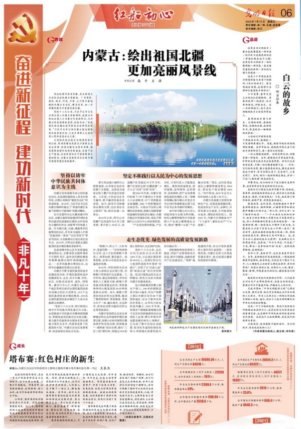 7月15日,《光明日報》6版刊發(fā)《奮進新征程建功新時代·非凡十年|內蒙古:繪出祖國北疆更加亮麗風景線》,全文如下: