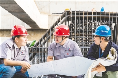 韓佳彤(中)在施工現(xiàn)場為團(tuán)隊人員指導(dǎo)工作。