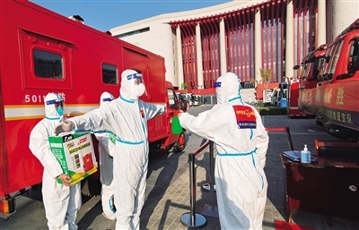 10月20日,在內(nèi)蒙古革命歷史博物館方艙醫(yī)院,呼和浩特市消防救援支隊消防員正在做個人消殺。本輪疫情發(fā)生以來,該支隊累計執(zhí)行消毒消殺任務300余次,完成室內(nèi)消殺近15萬平方米、消防安全線上檢查指導近500(家)次,為疫情防控貢獻消防力量。(內(nèi)蒙古日報社融媒體記者記者 懷特烏勒斯 通訊員 隆雪 攝)