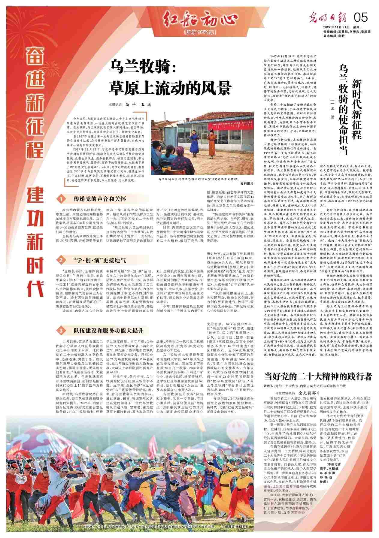 2017年11月21日,習(xí)近平總書記給蘇尼特右旗烏蘭牧騎的隊員們回信,勉勵他們大力弘揚(yáng)烏蘭牧騎的優(yōu)良傳統(tǒng),扎根生活沃土,服務(wù)牧民群眾,推動文藝創(chuàng)新,努力創(chuàng)作更多接地氣、傳得開、留得下的優(yōu)秀作品,永遠(yuǎn)做草原上的“紅色文藝輕騎兵”。5年來,總書記的殷殷囑托,激勵全區(qū)3500多名烏蘭牧騎隊員牢記初心使命、根植生活沃土,守正創(chuàng)新、踔厲奮發(fā),不斷創(chuàng)新服務(wù)形式,送歡樂、送文明,傳遞黨的聲音和關(guān)懷,為人民服務(wù)、為人民放歌。