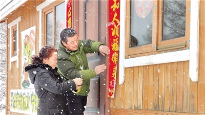 彭成良巡護(hù)回來(lái),天上飄起了雪花。夫妻倆一起貼春聯(lián)、窗花,掛燈籠,凍冰燈。嶄新的木屋,紅紅的燈籠,醒目的春聯(lián),五彩的冰燈……被裝扮一新的管護(hù)站瞬間年味兒十足。為了讓春節(jié)更有儀式感,二人決定再堆兩個(gè)雪人。