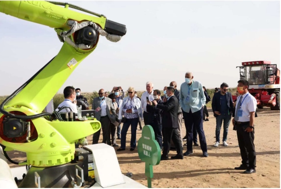 第八屆庫布其國際沙漠論壇上,外國嘉賓觀摩億利集團機器人植樹。