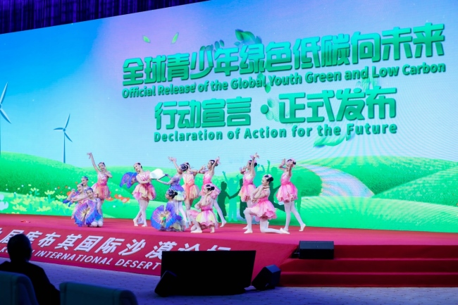 中福會少年兒童代表在論壇會議舞臺上帶來了創(chuàng)意獨特的“青少年、沙漠、未來”特別活動。通過少兒舞蹈與數(shù)字人互動表演的創(chuàng)新形式發(fā)布“全球綠色低碳發(fā)展青少年宣言”。