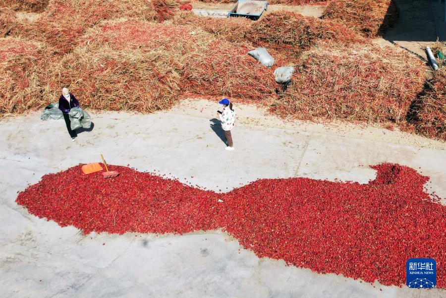??巴彥淖爾市臨河區(qū)白腦包鎮(zhèn)辣椒加工廠晾曬辣椒。新華社記者李云平 攝