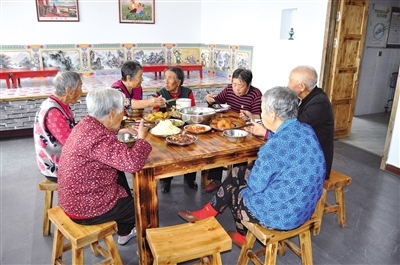 開飯了!老人們早已圍坐桌旁。柿子炒雞蛋、肉炒豆腐、炒豆芽、拌涼粉……六菜一湯三主食,飯菜美味適口,算上各種補(bǔ)貼,老人們吃一頓不到10塊錢。