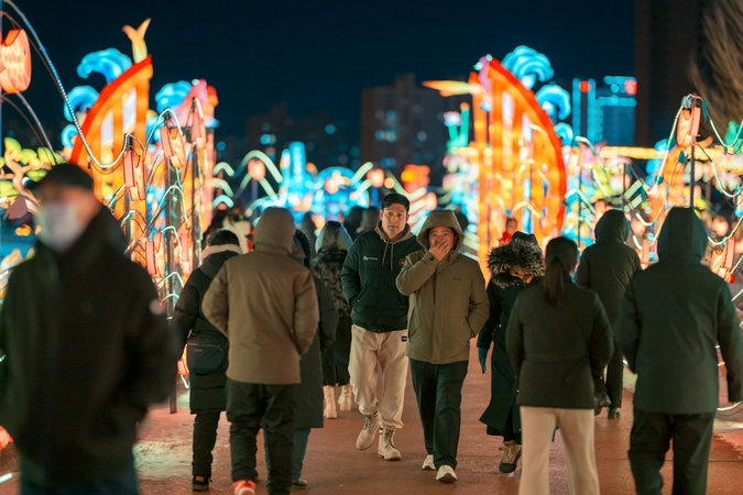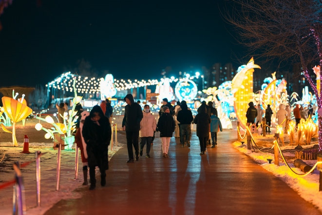 當(dāng)晚,呼和浩特零下15攝氏度左右,寒冷擋不住市民欣賞流光溢彩的燈會(huì),只見市民穿著保暖的外套,戴著帽子手套,一邊逛燈會(huì),一邊拍照片、拍視頻,還有的市民開直播,與全國(guó)各地的網(wǎng)友一起分享這美好時(shí)刻。