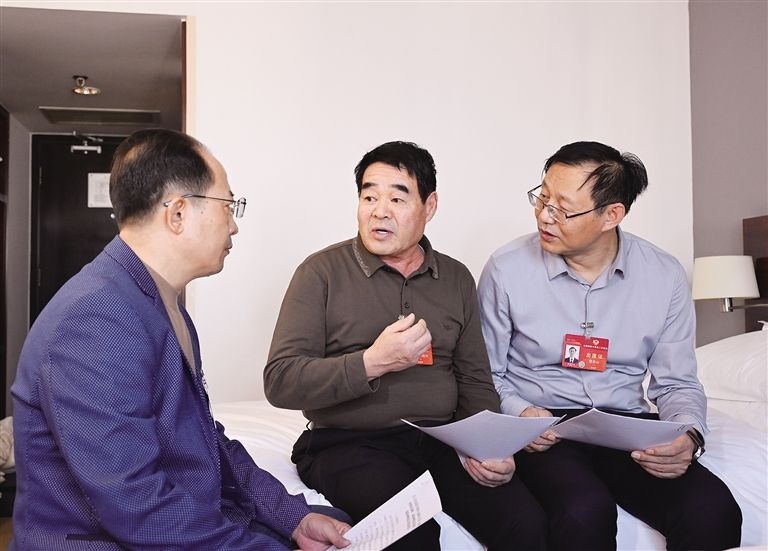 3月4日,住我區(qū)全國政協(xié)委員阿拉騰達來(左)、廷·巴特爾(中)、曹金山(右)在住地,就進一步提高草原生態(tài)保護補助獎勵標(biāo)準(zhǔn),為打贏“三北”工程攻堅戰(zhàn)和三大標(biāo)志性戰(zhàn)役奠定政策基礎(chǔ)的提案進行討論。草原全媒·內(nèi)蒙古新聞網(wǎng)記者 韓卿立 攝