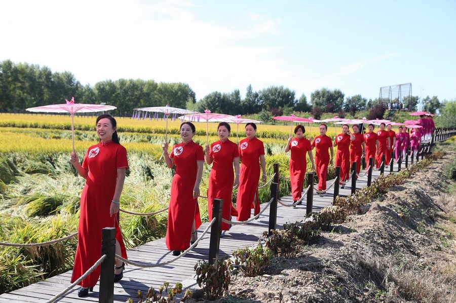 撐傘、轉身、回眸……旗袍愛好者們舉手投足盡顯高貴典雅的氣質,完美地秀出女性典雅溫婉、健康積極和充滿活力的新時代精神面貌, 成為扎賚特旗好力保稻谷景區(qū)一幅古韻靈動的畫卷。