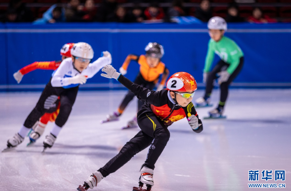 ??12月15日,參賽小選手在呼和浩特市冰雪運(yùn)動(dòng)系列活動(dòng)短道速滑公開賽比賽中。新華網(wǎng)發(fā)(丁根厚 攝)