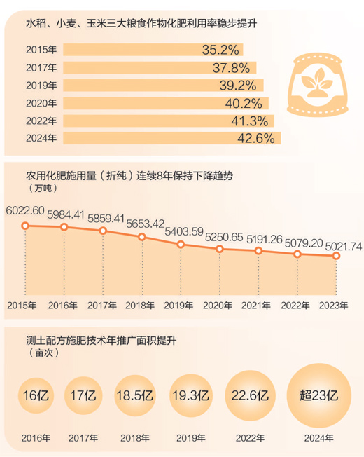 2024年,我國水稻、小麥、玉米三大糧食作物化肥利用率為42.6%,比2022年提高1.3個百分點?;世寐?,即化肥被作物吸收利用的比例,反映了化肥在農(nóng)業(yè)生產(chǎn)中的有效利用程度??茖W施肥效果提升,折射農(nóng)業(yè)發(fā)展方式之變。