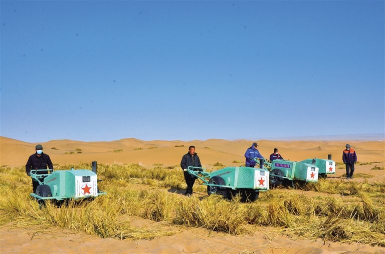 治沙人員正在用機器打草方格。記者 潘佳慧 攝