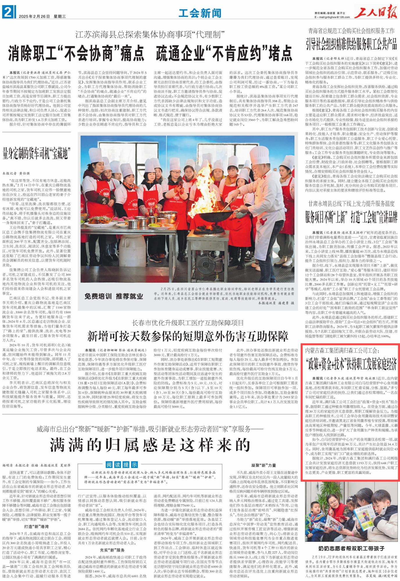 2025年2月26日,《工人日?qǐng)?bào)》第2版刊發(fā)題為《內(nèi)蒙古森工集團(tuán)滿歸森工公司工會(huì):“政策+資金+技術(shù)”扶持職工發(fā)展家庭經(jīng)濟(jì)》的消息,介紹了近年來(lái),內(nèi)蒙古森工集團(tuán)滿歸森工公司工會(huì)打出“政策+資金+技術(shù)”組合拳,鼓勵(lì)職工通過(guò)種植食用菌增加收入。