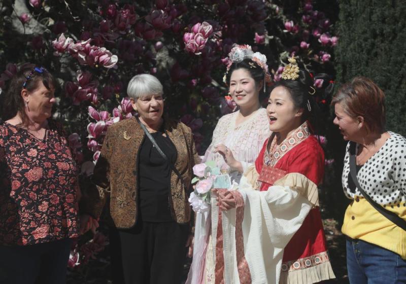 2025年3月1日,在美國伍德賽德的斐洛里莊園,漢服愛好者與游客在花朝節(jié)慶?;顒由辖涣?。新華社發(fā) 劉藝霖 攝