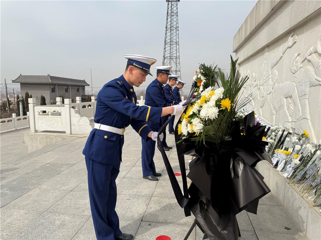 烏蘭察布市豐鎮(zhèn)市消防救援大隊(duì)工作人員向烈士紀(jì)念碑敬獻(xiàn)花籃。
