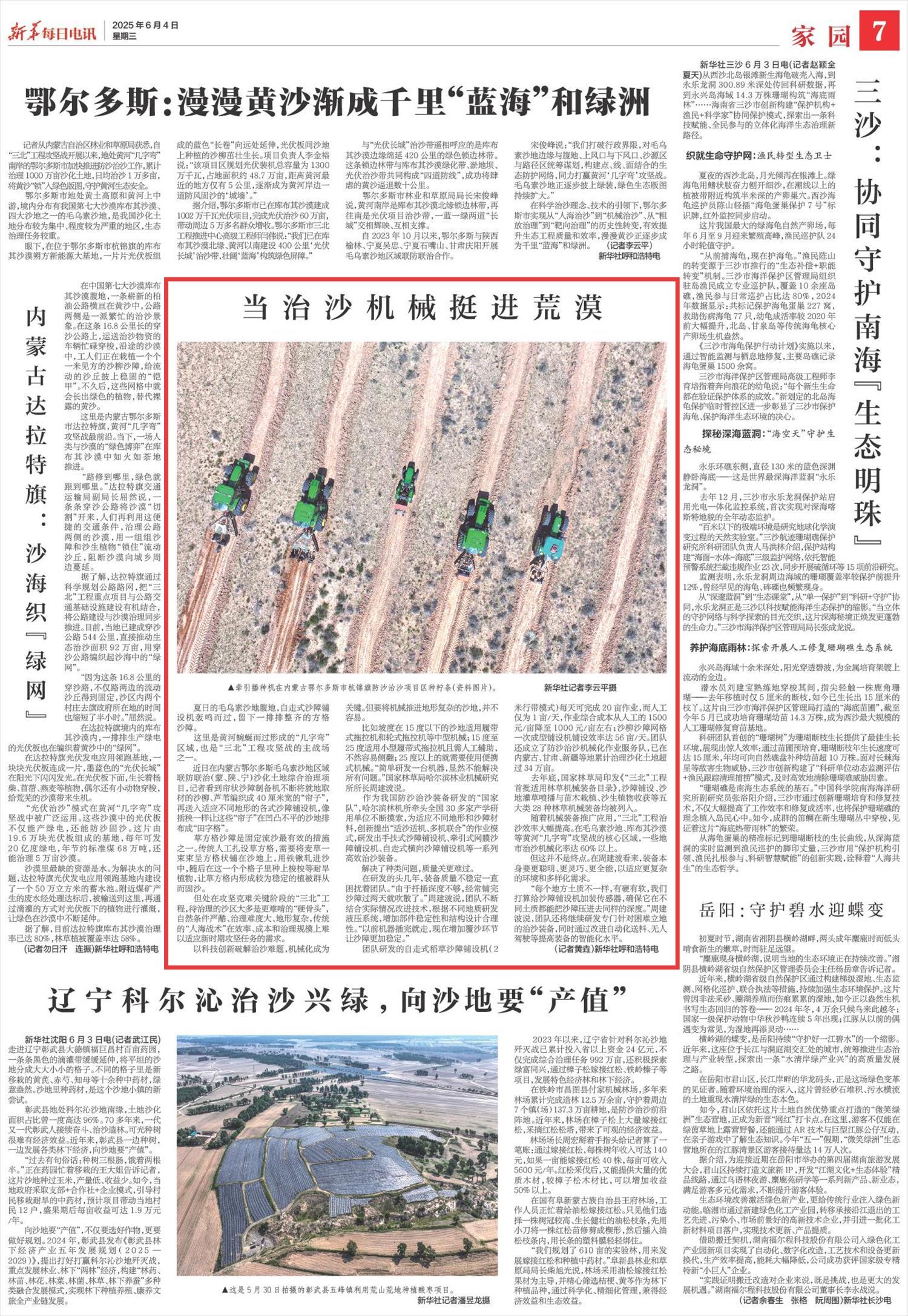 2025年6月4日,《新華每日電訊》第7版刊發(fā)題為《當(dāng)治沙機械挺進荒漠》一文,報道了內(nèi)蒙古鄂爾多斯毛烏素沙地區(qū)域聯(lián)防聯(lián)治(蒙、陜、寧)沙化土地綜合治理項目創(chuàng)新應(yīng)用系列機械化沙障鋪設(shè)裝備,適應(yīng)復(fù)雜地形,“三北”工程治沙效率大幅提高。毛烏素沙地、庫布其沙漠等黃河“幾字彎”攻堅戰(zhàn)的核心區(qū)域,一些地市治沙機械化率達60%以上。