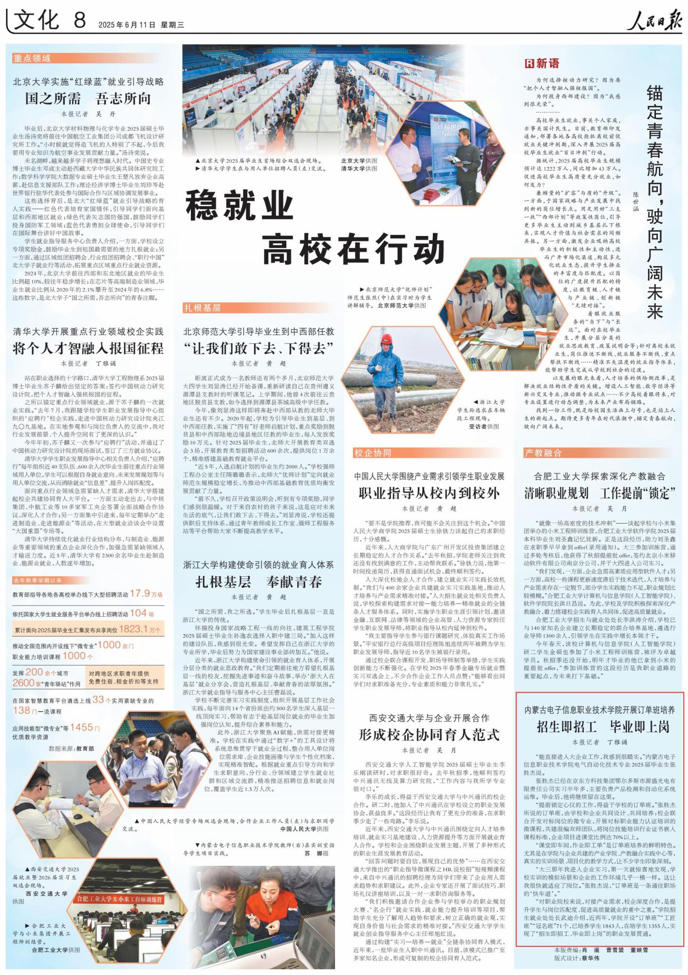 2025年6月11日,《人民日?qǐng)?bào)》第8版刊發(fā)題為《內(nèi)蒙古電子信息職業(yè)技術(shù)學(xué)院開展訂單班培養(yǎng) 招生即招工 畢業(yè)即上崗》的文章,報(bào)道了內(nèi)蒙古電子信息職業(yè)技術(shù)學(xué)院開設(shè)“訂單班”“工匠班”“冠名班”,實(shí)現(xiàn)了“招生即招工、畢業(yè)即上崗”的職業(yè)發(fā)展貫通。