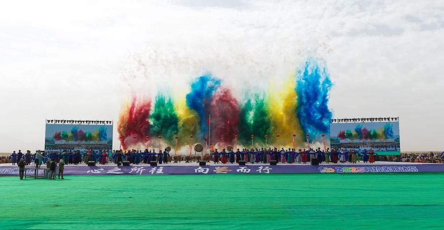2025阿拉善那達(dá)慕開幕式現(xiàn)場,舞臺上五彩煙霧升騰
