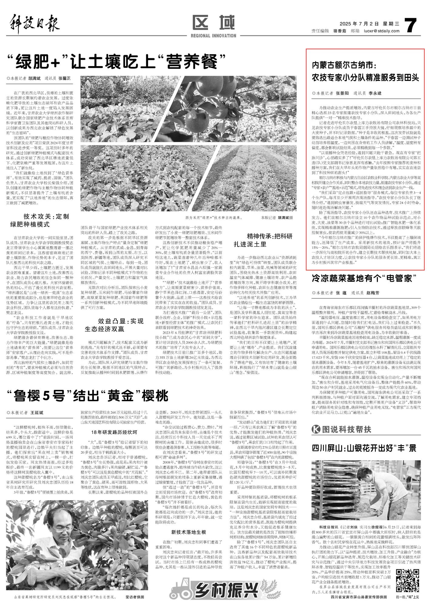 2025年7月2日《科技日?qǐng)?bào)》第7版刊發(fā)了《內(nèi)蒙古額爾古納市:農(nóng)技專(zhuān)家小分隊(duì)精準(zhǔn)服務(wù)到田頭》的文章,報(bào)道了內(nèi)蒙古呼倫貝爾市額爾古納市積極與內(nèi)蒙古自治區(qū)農(nóng)牧業(yè)科學(xué)院、內(nèi)蒙古農(nóng)業(yè)大學(xué)等高校院所建立合作關(guān)系,同時(shí)整合本地農(nóng)技力量,組建農(nóng)技專(zhuān)家小分隊(duì),通過(guò)“專(zhuān)家+農(nóng)戶(hù)”“基地+示范”模式,將先進(jìn)技術(shù)和理念送到農(nóng)業(yè)生產(chǎn)一線。