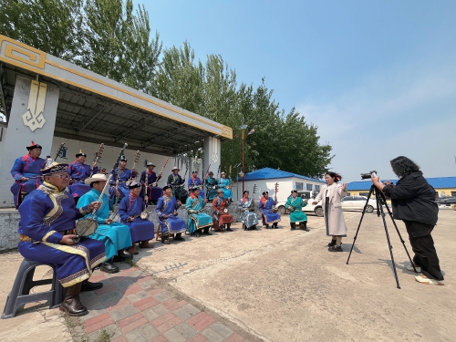 5月21日,記者走進(jìn)吐列毛杜鎮(zhèn)鐵特格嘎查,恰巧遇到鎮(zhèn)黨委宣傳委員高薩日娜正在拍攝最新一期的《村聞聯(lián)播》。嘎查小舞臺(tái)上,17名村民身著蒙古族服飾,手持四胡演奏著《烏力格爾三部曲》《牧民歌唱共產(chǎn)黨》等悠揚(yáng)的樂(lè)曲。他們大部分年齡都在五六十歲,來(lái)自當(dāng)?shù)氐睦ざ祭渌暮鷧f(xié)會(huì)。該協(xié)會(huì)共有60余名會(huì)員,多年來(lái)以四胡彈奏、科爾沁民歌、烏力格爾(一種蒙古族的曲藝說(shuō)書形式)、好來(lái)寶說(shuō)唱等各種方式,參與著吐列毛杜鎮(zhèn)文化志愿服務(wù)。