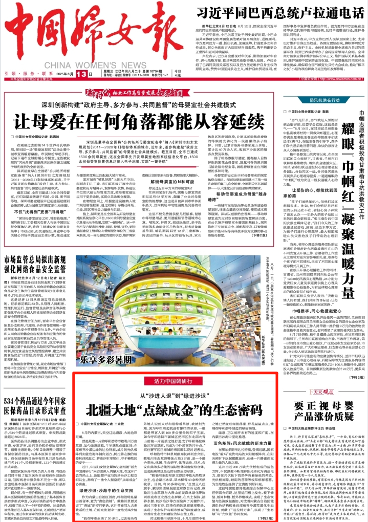 2025年8月13日,《中國婦女報》第1版刊發(fā)題為《從“沙進人退”到“綠進沙退” 北疆大地“點綠成金”的生態(tài)密碼》的文章,報道了“活力中國調(diào)研行”采訪團深入內(nèi)蒙古大地,在這片廣袤的熱土上,新能源產(chǎn)業(yè)與防沙治沙工程交織共生,奏響了一曲令人振奮的“點綠成金”協(xié)奏曲。
