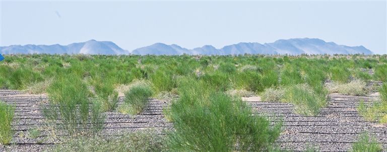 “這里是內(nèi)蒙古阿拉善盟西部荒漠綜合治理項(xiàng)目(二期)額濟(jì)納河片區(qū),是內(nèi)蒙古深入貫徹落實(shí)國家生態(tài)戰(zhàn)略、打贏河西走廊—塔克拉瑪干沙漠邊緣阻擊戰(zhàn)關(guān)鍵戰(zhàn)場之一。我們?cè)谶@里人工種草6萬畝,現(xiàn)在已經(jīng)全部完成栽種,正在進(jìn)行養(yǎng)護(hù)工作?!鳖~濟(jì)納河片區(qū)負(fù)責(zé)人關(guān)新偉介紹,項(xiàng)目由阿拉善盟林業(yè)和草原局推進(jìn),中國建筑一局有限公司、中鐵四局集團(tuán)有限公司等承建,額濟(jì)納旗林業(yè)和草原局為項(xiàng)目建設(shè)提供技術(shù)支撐。