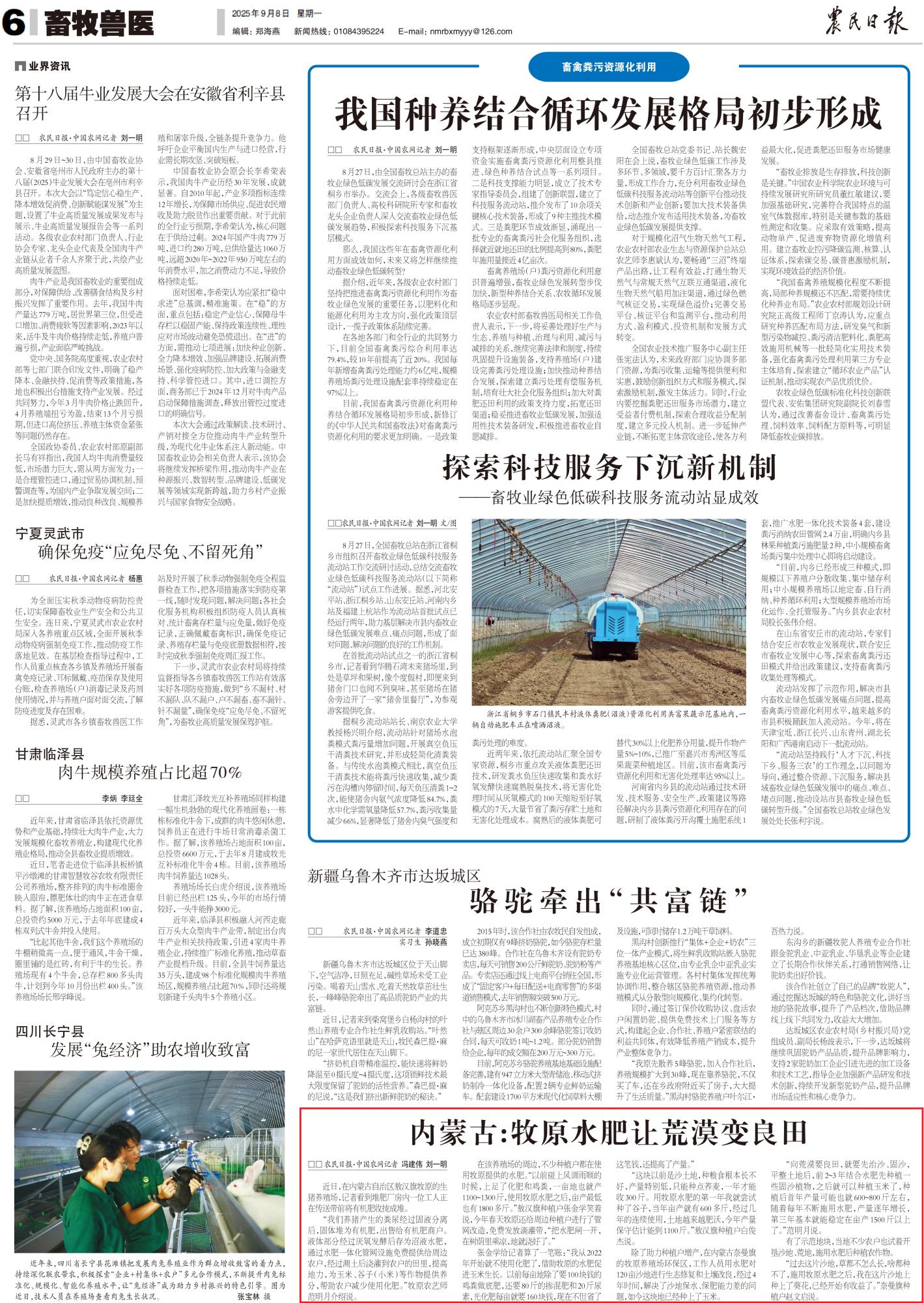2025年9月8日,《農(nóng)民日?qǐng)?bào)》第6版整版刊發(fā)題為《內(nèi)蒙古:牧原水肥讓荒漠變良田》的文章,報(bào)道了在內(nèi)蒙古奈曼旗的牧原養(yǎng)殖場(chǎng)環(huán)保區(qū),工作人員用水肥對(duì)120畝沙地進(jìn)行生態(tài)修復(fù)和土壤改良,經(jīng)過4年時(shí)間,解決了沙地保水、保肥能力差的問題,如今這塊地已經(jīng)種上了玉米。