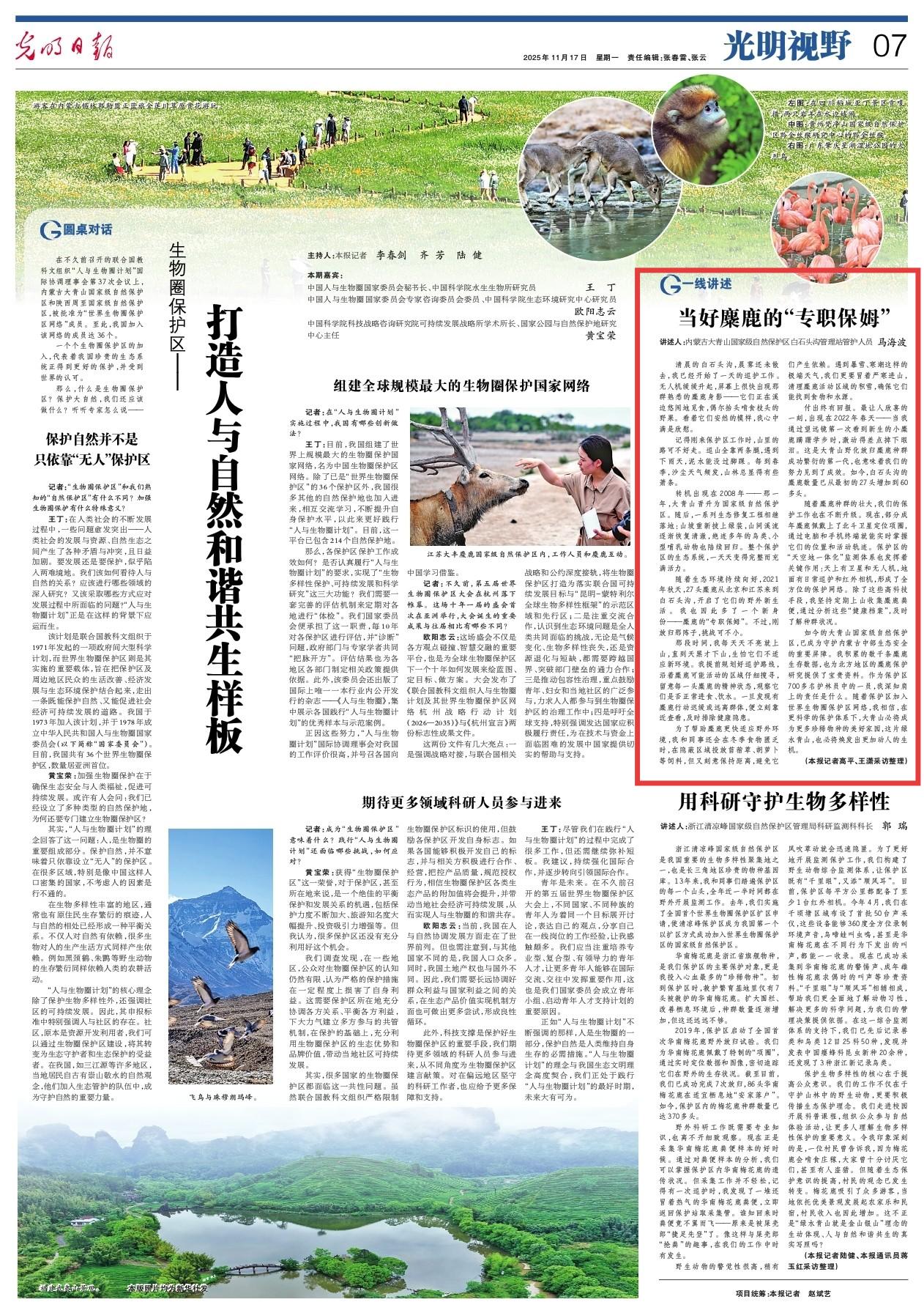 2025年11月17日,《光明日報》第7版刊發(fā)題為《當好麋鹿的“專職保姆”》的文章,以內(nèi)蒙古大青山國家級自然保護區(qū)白石頭溝管理站管護人員馬海波的視角,講述當好麋鹿的“專職保姆”的故事,如今白石頭溝的麋鹿數(shù)量已從最初的27頭增加到60多頭。