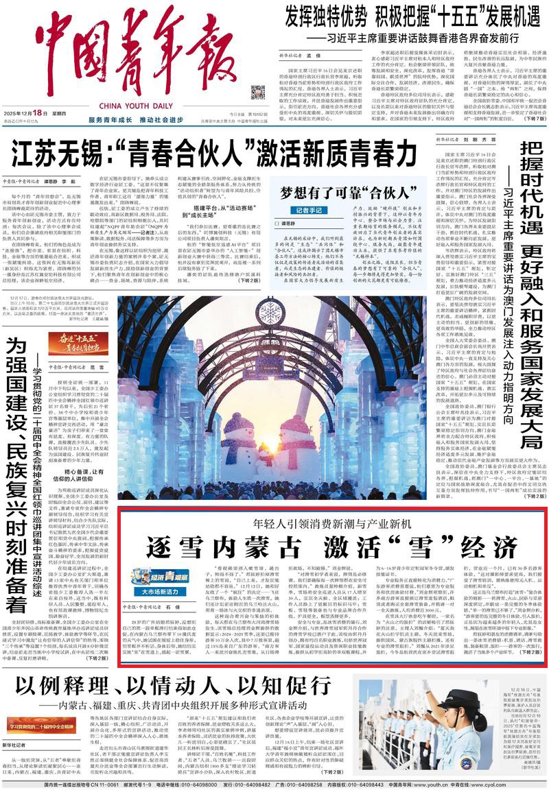 2025年12月18日《中國青年報》第1版刊發(fā)了《大市場新活力 年輕人引領消費新潮與產(chǎn)業(yè)新機 逐雪內(nèi)蒙古 激活“雪”經(jīng)濟》的文章,報道了烏蘭察布大河灣滑雪場是打造“冰雪+”復合體驗的縮影——將滑雪、火山、民俗與草原深度綁定,串聯(lián)成一條完整的冬季體驗鏈。