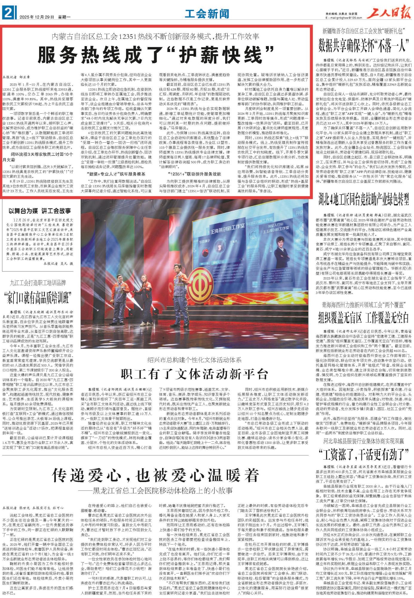 2025年12月29日,《工人日報(bào)》第2版刊發(fā)題為《服務(wù)熱線成了“護(hù)薪快線”》的文章,報(bào)道了內(nèi)蒙古自治區(qū)總工會12351熱線開通兩年以來,傾聽職工心聲、化解勞動糾紛,成為維護(hù)職工合法權(quán)益的“暖心橋”和“維權(quán)盾”。其中,熱線共受理零散農(nóng)民工欠薪投訴738起,為上千名農(nóng)民工追回欠薪。