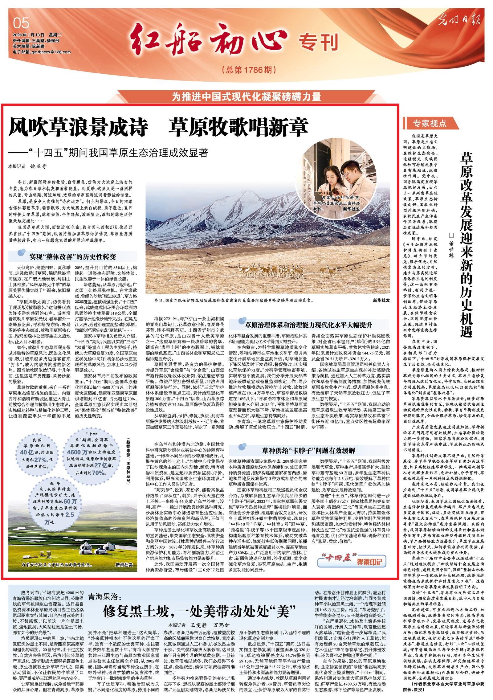 2026年1月13日,《光明日?qǐng)?bào)》5版刊發(fā)題為《風(fēng)吹草浪景成詩 草原牧歌唱新章——“十四五”期間我國草原生態(tài)治理成效顯著》的文章,報(bào)道了“十四五”期間,我國持續(xù)加強(qiáng)草原保護(hù)修復(fù),草原生態(tài)質(zhì)量持續(xù)改善,交出一張綠意充盈的草原治理成績單。