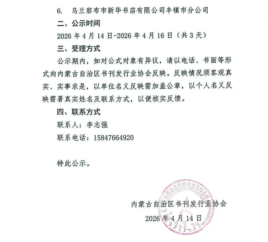公示期內(nèi),如對(duì)公式對(duì)象有異議,請(qǐng)以電話(huà)、書(shū)面等形式向內(nèi)蒙古自治區(qū)書(shū)刊發(fā)行業(yè)協(xié)會(huì)反映。反映情況須客觀真實(shí)、實(shí)事求是,以單位名義反映需加蓋公章,以個(gè)人名義反映需署真實(shí)姓名及聯(lián)系方式,以便核實(shí)反饋。