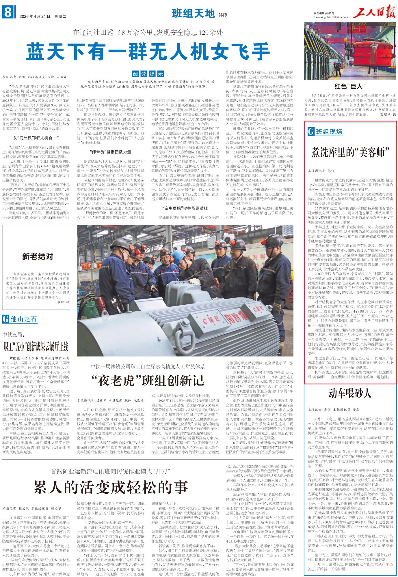 2026年4月21日,《工人日報(bào)》第8版刊發(fā)題為《煮洗庫里的“美容師”》的文章,報(bào)道了53歲的朱運(yùn)達(dá),是中國鐵路呼和浩特局集團(tuán)有限公司大板機(jī)務(wù)段的煮洗工,煮洗工們從不曾出現(xiàn)在旅客的視野中,但這群幕后“美容師”,一直在默默守護(hù)鋼鐵巨龍的每一趟馳騁。