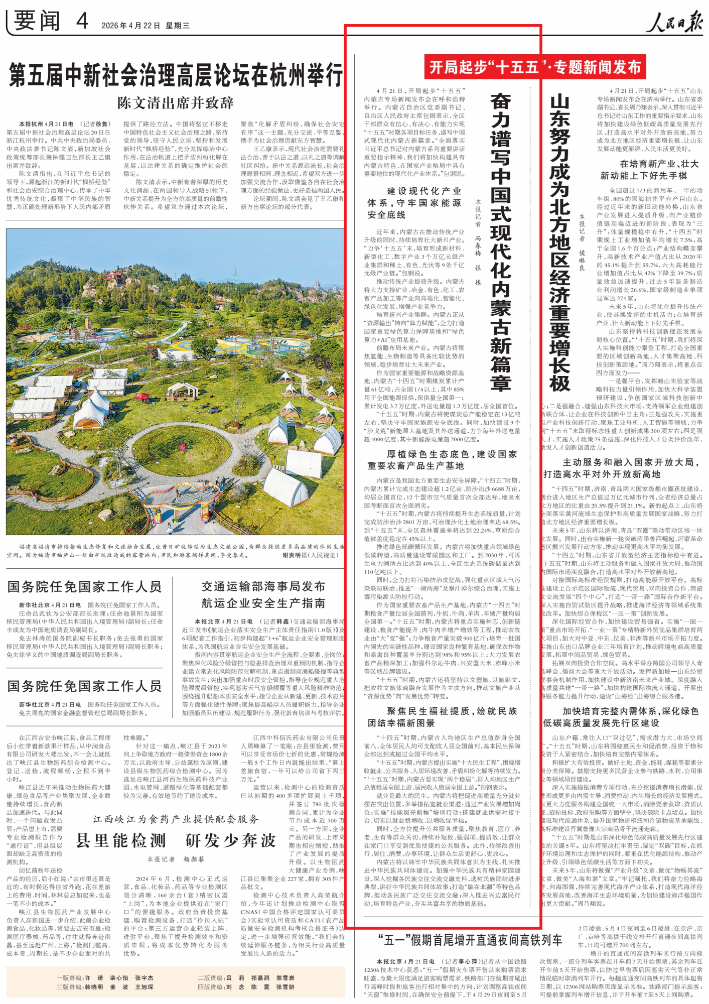 2026年4月22日,《人民日報》第4版刊發(fā)題為《奮力譜寫中國式現(xiàn)代化內(nèi)蒙古新篇章》的文章,報道了4月21日,開局起步“十五五”內(nèi)蒙古專場新聞發(fā)布會在呼和浩特舉行。