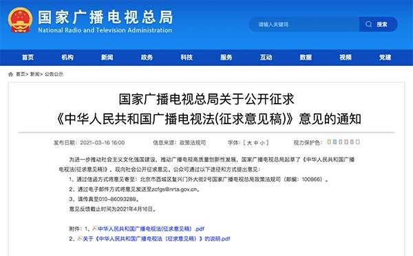 3月16日,國家廣播電視總局發(fā)布《中華人民共和國廣播電視法(征求意見稿)》(以下簡稱“征求意見稿”),向社會公開征求意見。征求意見稿分為總則、業(yè)務(wù)準(zhǔn)入、制作播放、傳輸覆蓋、公共服務(wù)、扶持促進(jìn)、安全保障、監(jiān)督管理、法律責(zé)任和附則,共10章80條。意見反饋截止日期為2021年4月16日。