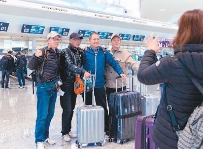 2月8日,前往印尼巴厘島的旅行團(tuán)游客在浙江杭州蕭山國際機(jī)場(chǎng)T4航站樓拍照留念。 龍 巍攝(人民圖片)