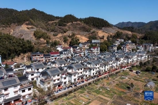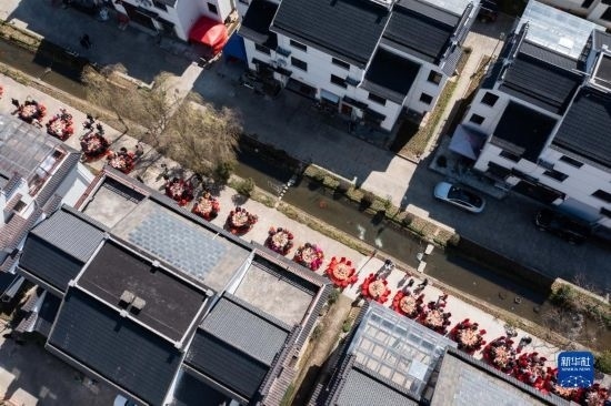 2月26日空中俯瞰蓮花鎮(zhèn)戴家新村的百家宴(無人機(jī)照片)。