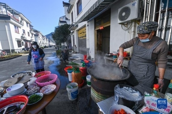 2月26日,蓮花鎮(zhèn)戴家新村的村民在新居門前烹飪農(nóng)家菜,為百家宴做準(zhǔn)備。