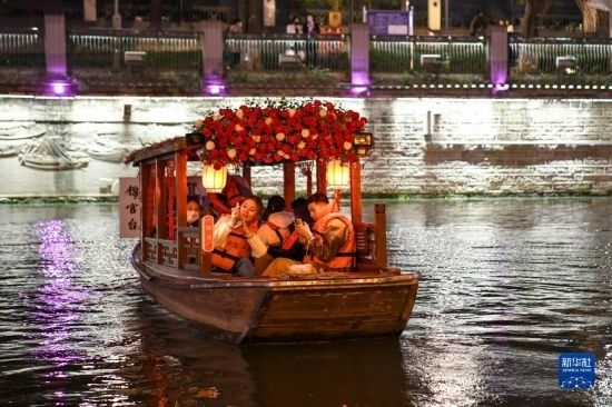 在四川省成都市“夜游錦江”游覽河段,工作人員在游船上與乘客互動(dòng)(3月1日攝)。
