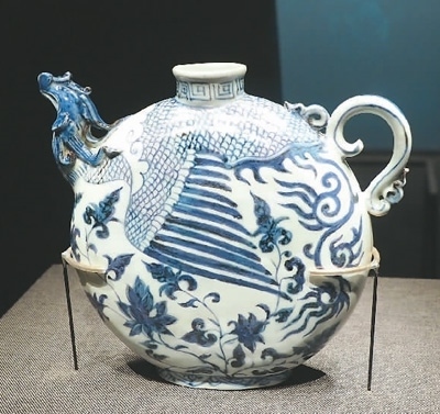 一件精美的青花鳳首扁壺引人注目。此壺出土于北京舊鼓樓大街豁口以東一處元代院落遺址。壺身為扁圓形,以鳳首為流,鳳尾作柄,用青料在壺身上繪出展翅飛翔的鳳鳥,器形與紋飾渾然一體,構(gòu)思精絕?!斑@是首都博物館收藏的國家一級文物?!闭挛挠勒f,“青花瓷體現(xiàn)了元代承接唐宋并對不同文化兼容并蓄的時代氣象,元大都正是在這種氛圍中誕生的偉大杰作。”