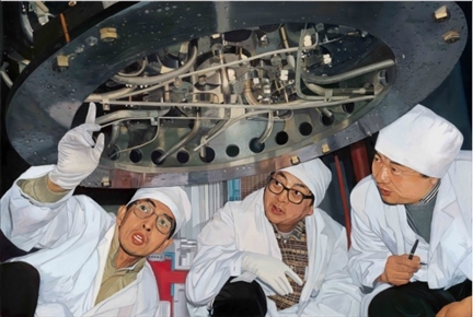 布面油畫《知難而進 眾志成城》原型為新華社記者王呈選拍攝的一幅新聞?wù)掌?,畫面?0世紀80年代末清華大學(xué)核能與新能源技術(shù)研究院王大中、馬昌文、董鐸正在進行5兆瓦低溫核反應(yīng)堆調(diào)試的場景。作品生動地刻畫了以國家最高科學(xué)技術(shù)獎獲得者王大中院士等為代表的清華教師勇于承擔國家重大科技項目,知難而進、眾志成城的寶貴精神。