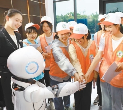 “數(shù)游峨眉”體驗中心,參加研學的學生與智能講解機器人互動。 峨眉山市融媒體中心供圖