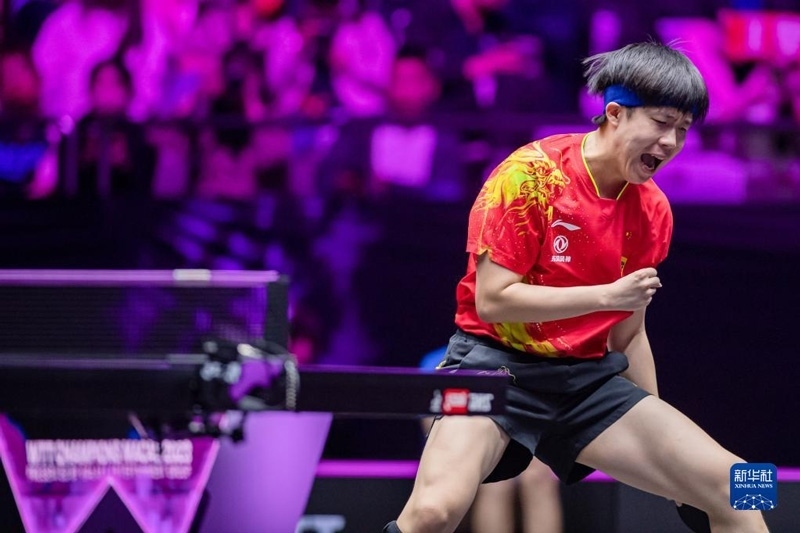 2023年4月23日,王曼昱在比賽中慶祝得分。當(dāng)日,在澳門塔石體育館舉行的2023世界乒乓球職業(yè)大聯(lián)盟(WTT)澳門冠軍賽女子單打決賽中,中國選手王曼昱以4比2戰(zhàn)勝隊(duì)友陳夢,奪得冠軍。新華社記者 張金加攝