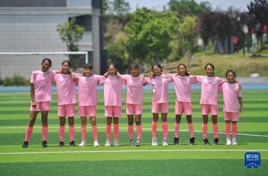 來(lái)自涼山彝族自治州的9名小球員俄地么你作、舍布么扯鳩莫、候杰欣、吉聯(lián)么李雪、呂小英、趙明練、楊貴洋、拉普么拉扎、楊建鑫(從右至左)在瀘州天立春雨學(xué)校足球場(chǎng)留影(5月12日攝)。