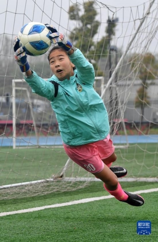 在瀘州天立春雨學(xué)校足球場(chǎng),來(lái)自涼山彝族自治州的拉普么拉扎在進(jìn)行守門員訓(xùn)練(3月29日攝)。