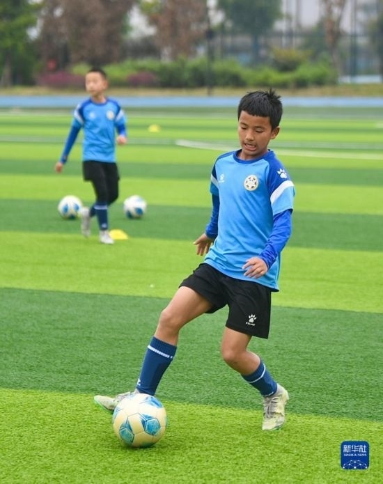 在瀘州天立春雨學(xué)校足球場(chǎng),來(lái)自涼山彝族自治州的楊坤在進(jìn)行訓(xùn)練(3月28日攝)。