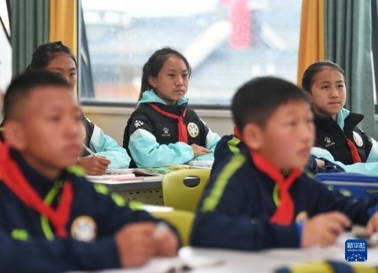 在瀘州天立春雨學(xué)校教室,來(lái)自涼山彝族自治州的舍布么扯鳩莫(中)在課堂上聽講(3月28日攝)。