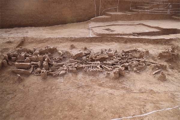 在“郭城”東南拐角處,發(fā)現(xiàn)一條殷墟時期的大型祭祀溝,長達19.36米,溝內(nèi)堆疊了3層人骨及動物骨骼,初步清理出完整的人骨3具,以及肢解的牛骨、豬骨、馬骨、鳥骨等,經(jīng)動物考古學家辨認至少分屬17個動物個體??脊趴碧竭€發(fā)現(xiàn)不同時期的道路遺跡穿過城壕,為探討洹北商城內(nèi)外部交通路網(wǎng)提供了重要線索。