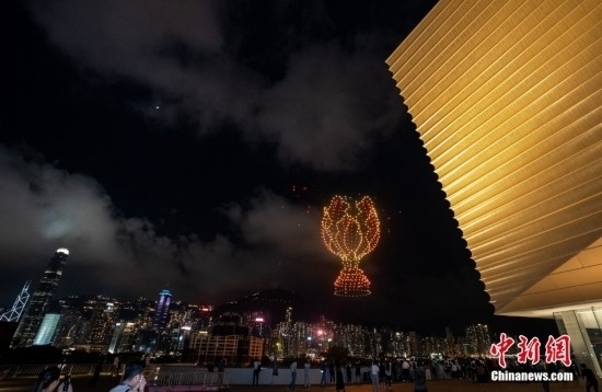 6月22日晚間,“紫荊花之夜”無人機(jī)燈光創(chuàng)意秀在香港故宮文化博物館畔的海面上空舉行,2000架無人機(jī)演繹多個(gè)與“端午節(jié)”相關(guān)的圖案,點(diǎn)亮香港夜空。圖為無人機(jī)組成紫荊花圖案。